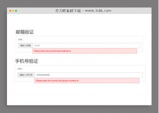 该特效基于JavaScript实现的表单验证特效,鼠标点击提交按钮即可验证表单字段。如当前表单字段有错误,则文本框边框呈红色,且下方显示错误提示。