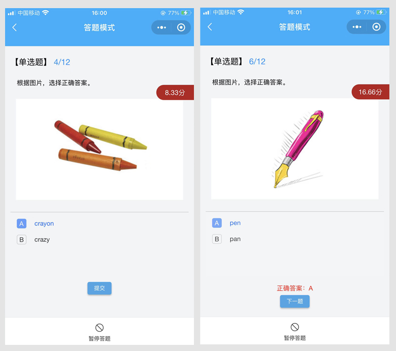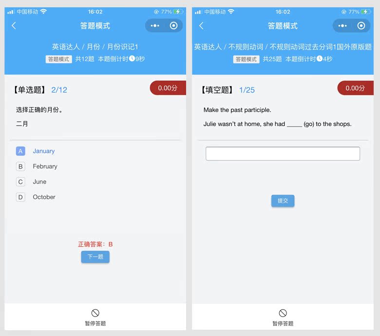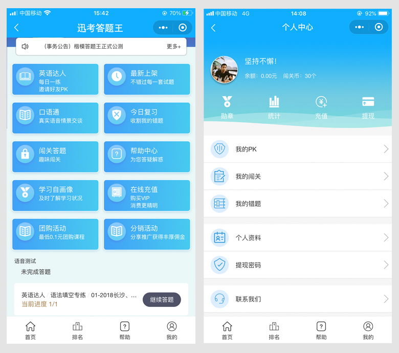 3、带4中答题模式:练习模式、答题模块、PK模式、闯关模式。