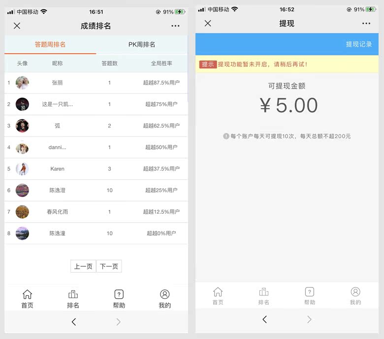9、成绩排名:根据用户的答题成绩,自动统计排名情况。