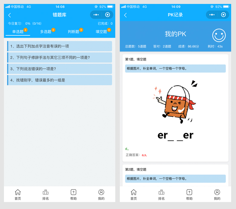8、错题库:用户答题过程中自动记录错题,系统智能安排用户复习。