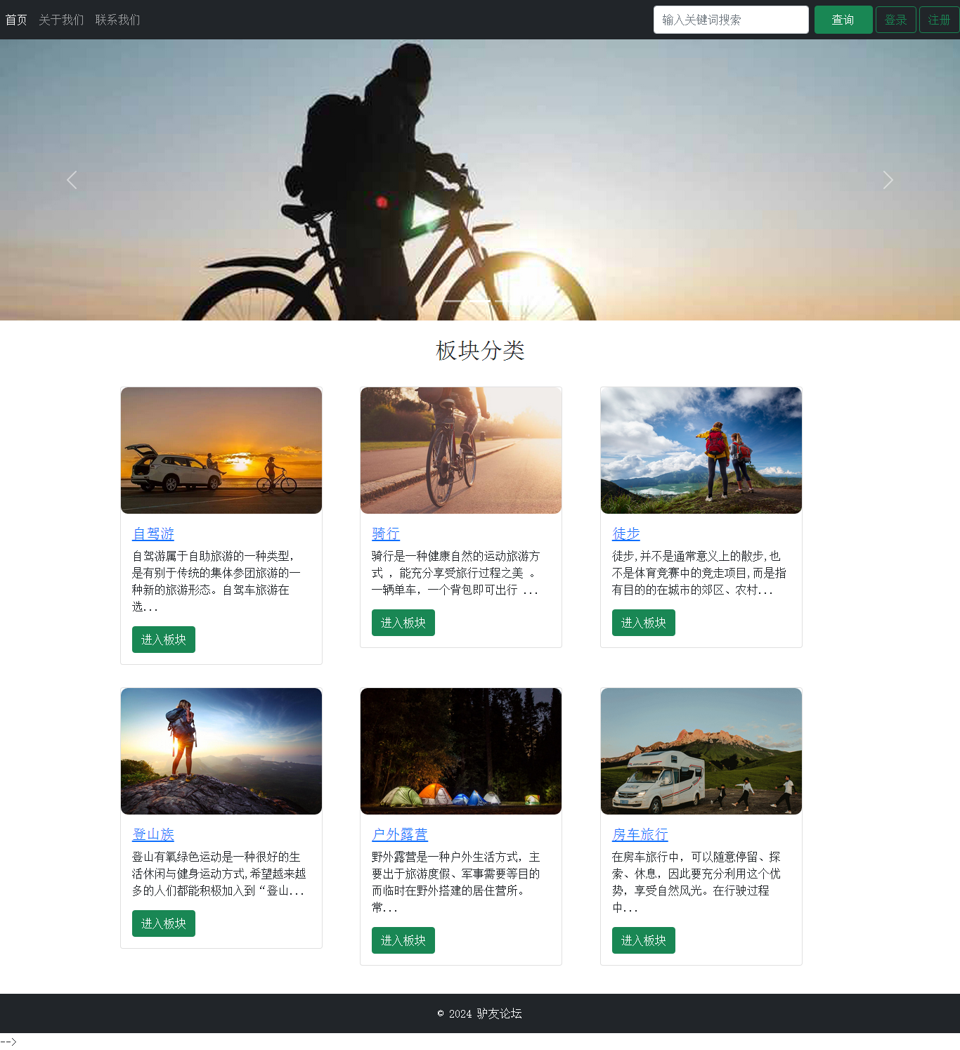 前台功能:版块分类、全屏幻灯片、帖子列表、帖子详情、搜索帖子、会员注册、会员登录、安全退出。
