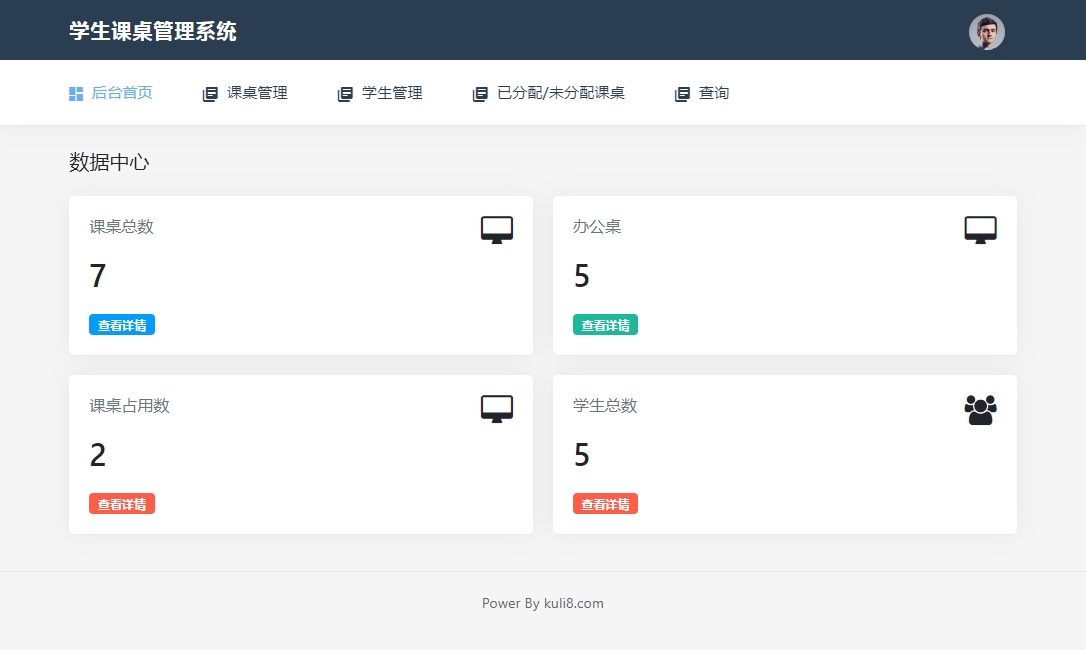 3)数据统计:登录成功后的后台首页,主要是展示各个模块的数据统计情况。包含:课桌总数、办公桌、课桌占用数、学生总数。