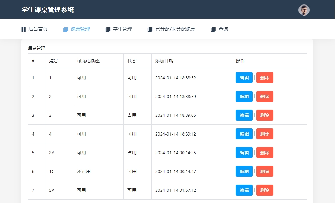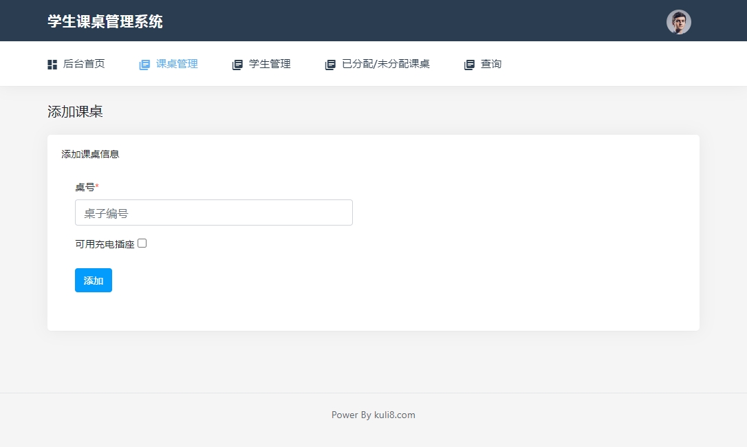 4)课桌管理:添加课桌、课桌列表。课桌数量及信息可自主添加,里面可设置当前座位是否有“可充电插座”选项,非常人性化。