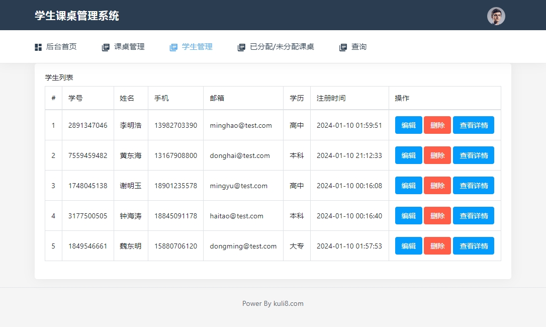 5)学生管理:添加学生、学生列表。添加学生字段包含:学号(可自动生成)、姓名、邮箱、手机、地址、学历。学生列表中可编辑删除学生,以及查看该学生历史的座位分配情况,一览无余。