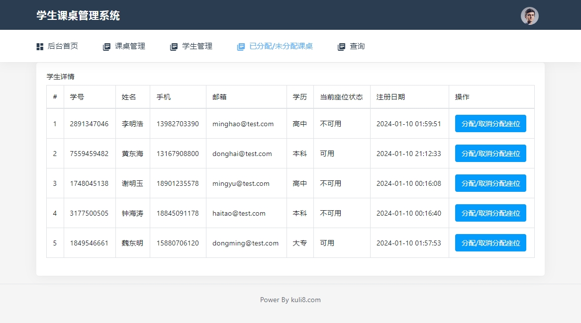 6)分配课桌:在此模块罗列了所有学生的列表信息,可以针对某一个学生进行座位分配/取消分配操作。