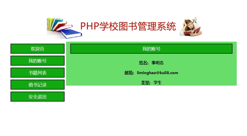 学生/老师端:功能比较简单,主要就是查看自己的账号信息和书籍列表、借书记录、退出账号。