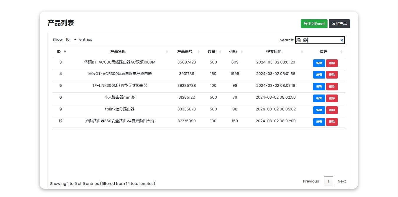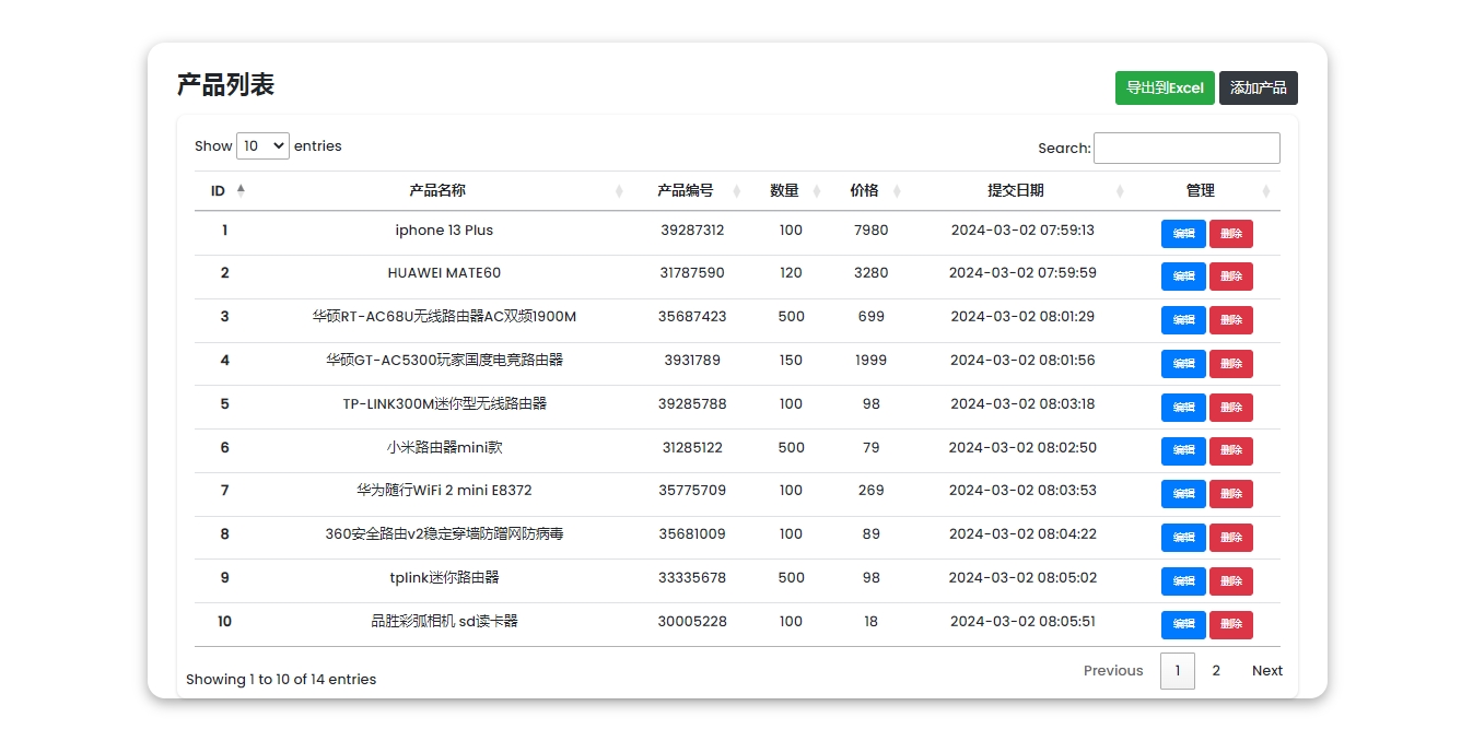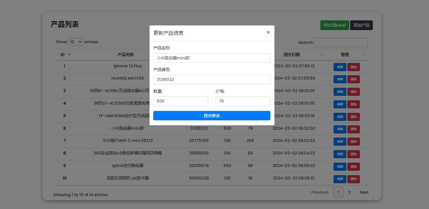 此源码程序是一款产品在线管理系统源码,基于PHP+MYSQL原生开发,支持批量导出Excel表格数据,自动分页和查询产品信息,此程序无后台管理系统,请知悉~