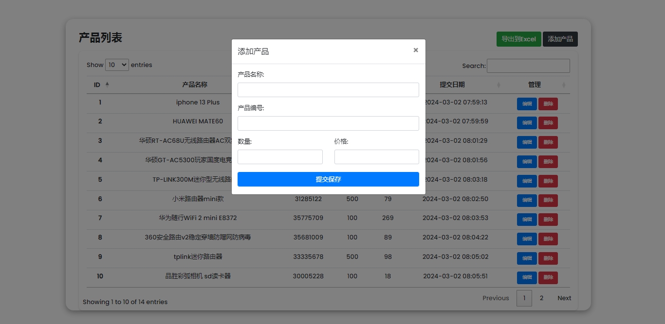 1)添加产品:共4个表单字段,产品名称、编号、数量(库存)、价格。