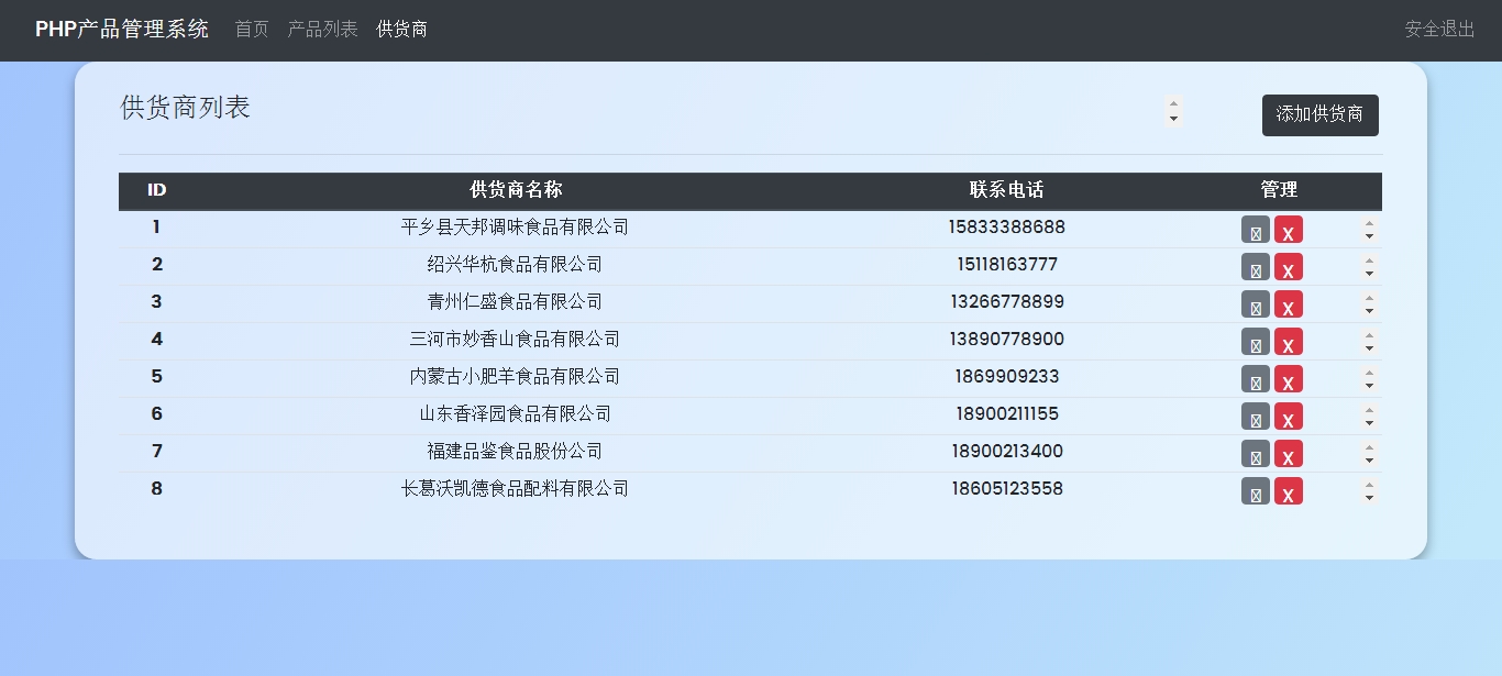 此源码程序是一款产品信息管理系统源码,基于PHP+MYSQL原生开发,主要功能包含:管理员登录、数据统计、产品列表、供货商列表,可自由添加产品和供货商。
