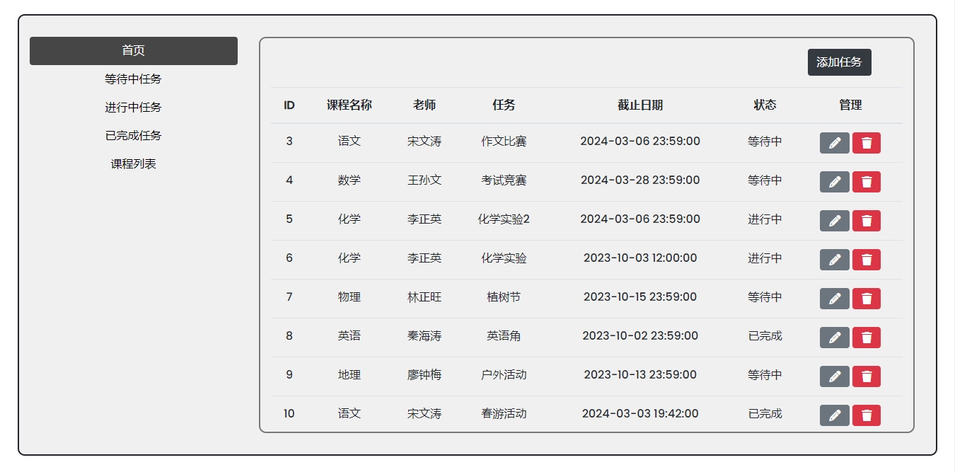 此源码程序是一款学校课程安排网站系统源码,基于PHP+MYSQL原生开发,主要功能包含:任务列表、课程列表,点击左侧主菜单可对任务状态进行筛选查看,可添加任务、添加课程。