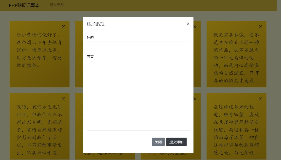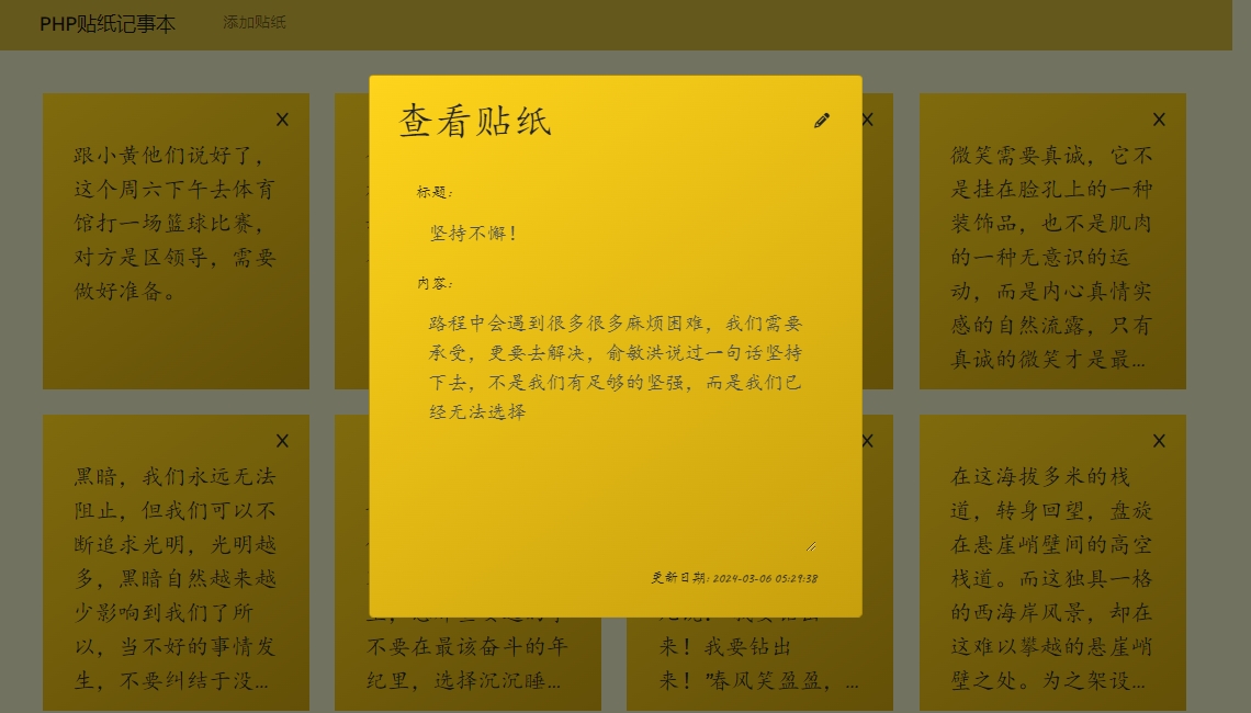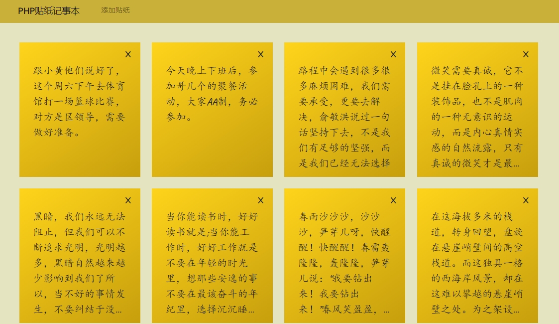 此源码程序是一款响应式在线在线便签贴纸记事本网站源码,支持贴纸的增删查改,非常简单方便。有兴趣的小伙伴可以在此版本基础上做二次开发、功能拓展。此程序无后台管理系统,请知悉!