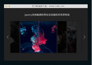 这是一款图片滚动查看器,带自动切换播放功能。支持使用触摸滑动或使用鼠标点击下一个和上一个箭头按钮进行切换图片。