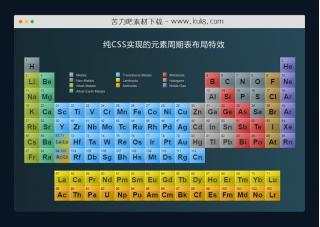 HTML和CSS代码创建的元素周期表,元素按类型进行分类,直观的展现了化学元素及其特性,鼠标移至元素区块带翻转动画。
