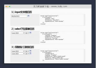 一款功能丰富的日期选择器插件,不仅适用多种表单类型,还可以自定义回调,非常的实用。 可运用在input/select等表单元素使用,还可进行日期区间范围选取,以及设置弹出层点选特效,非常的灵活丰富。