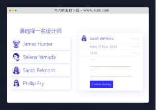 一款支持选择日期时间的在线预约模板,点选人员进入到日历表,点选日期,再次选择对应的时间,最后输入邮箱和姓名即可预约成功。