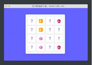 这是一款翻牌小游戏代码,有16张问号卡牌中,需要鼠标点击翻出两张卡牌都有相同的图案,但每张卡牌都是随机放置的,找卡牌没有时间限制。
